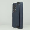 • Blue phone case with detailed view of stitching and card slots on a gray background