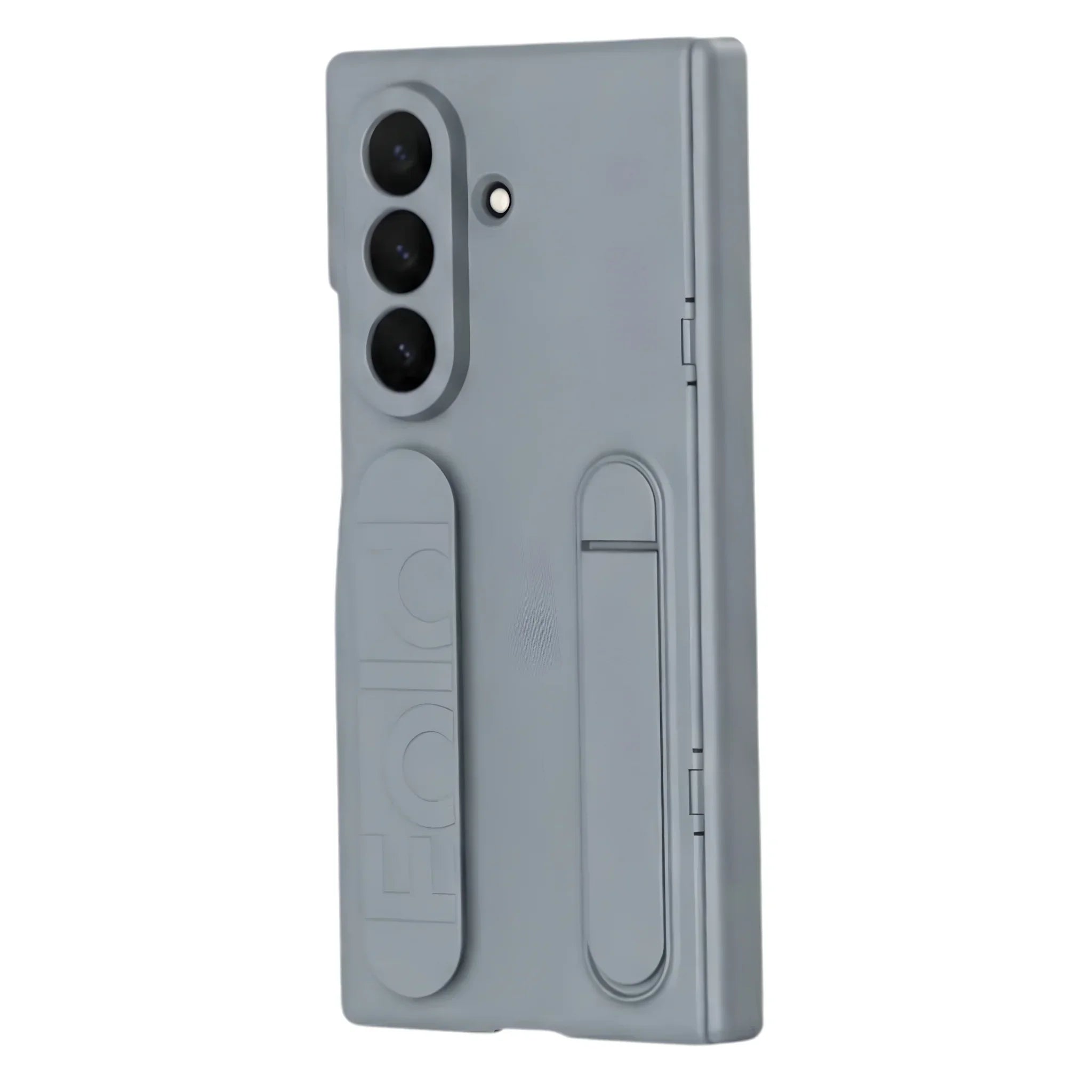 Gray protective case with kickstand on smartphone, featuring triple rear cameras and front screen